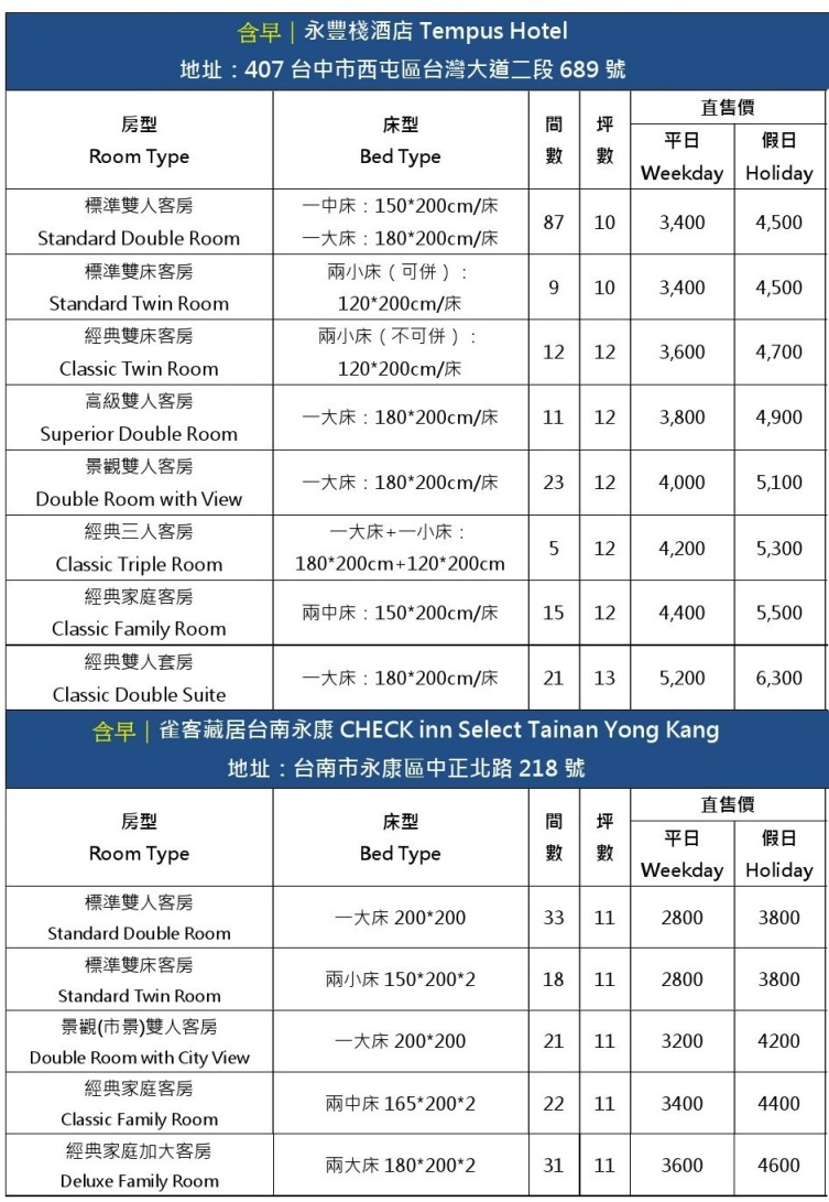 依房型房價含早餐。每房加人或加早餐請依飯店為主。