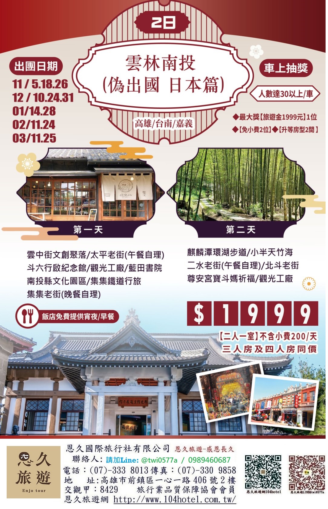 恩久國際旅行社有限公司 服務專線:電話(07)333-8013