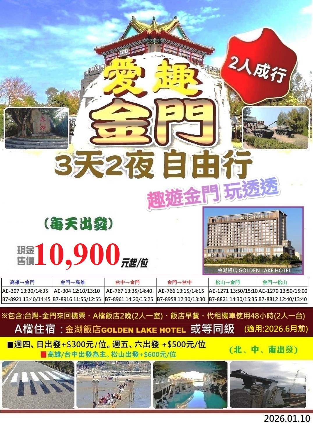 4. 自由行套裝優惠專案台灣-金門國內班機機票為優惠票,敬老及身障與小孩均為成人價。